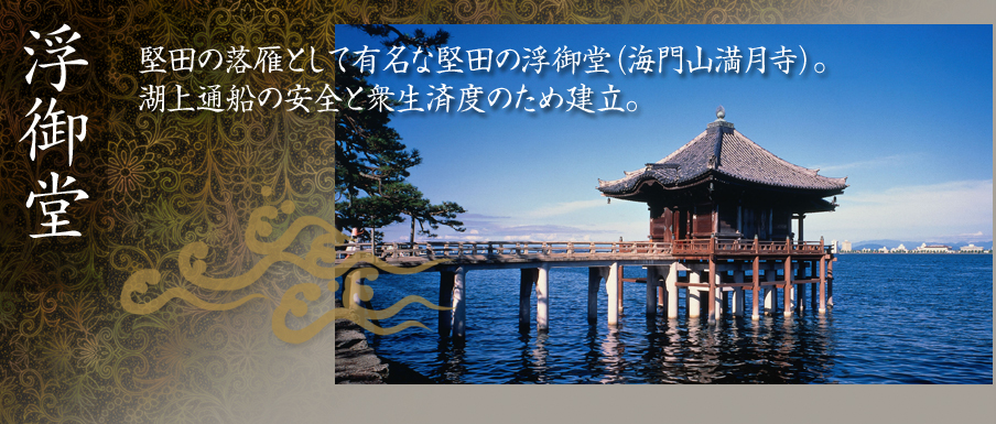 近江八景の一つ堅田の落雁として有名な堅田の浮御堂は、びわ湖の最狭部に位置し、海門山満月寺と称する禅寺で京都紫野大徳寺に属する。昔一条天皇の長徳年間(995年頃)比叡山横川恵心院に住した源信(恵心)僧都が、びわ湖を山上より眺め湖中に一宇を建立して自ら一千体の阿弥陀仏を刻んで「千仏閣」「千体仏堂」と称し湖上通船の安全と衆生済度を発願したに始まる。因みに僧都は、我が国の宗教思想に大きな影響を与え、浄土教学の基礎を樹立した「往生要集」の著者である。真宗伝灯第六祖と仰がれている。